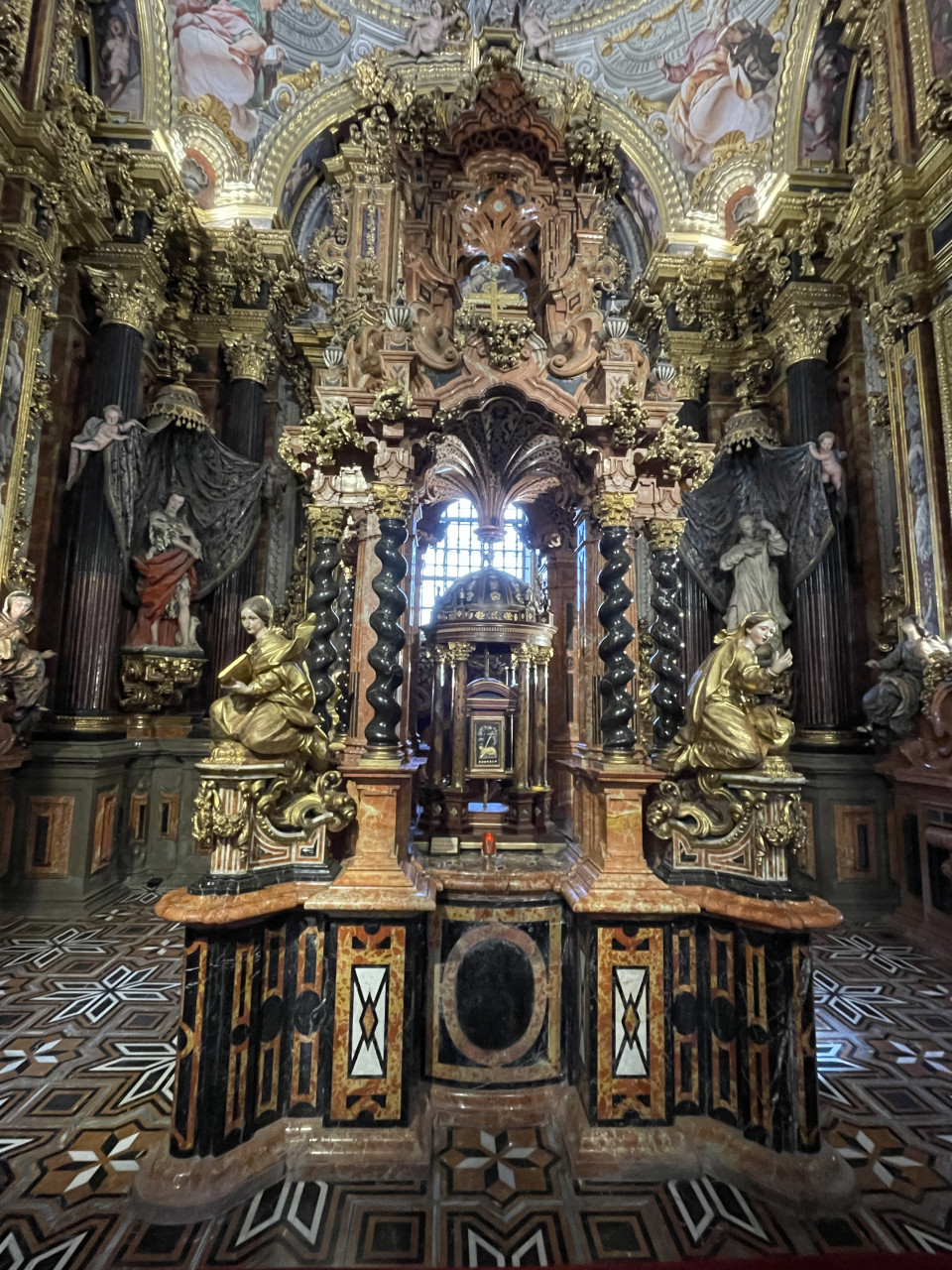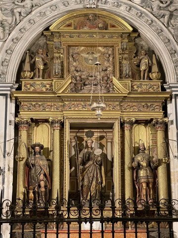 Das Sakramentshäuschen beeindruckt ganz besonders und ist mit Worten kaum zu beschreiben. Die Verwendung der verschiedenen Materialien, wie farbiger Marmor, glänzende Goldverzierung, Skulpturen, Malereien, Himmel, Vorhänge und des Lichteinfalls führt zu einer beeindruckenden Theatralik in tief religiösem Sinn. In der Mitte befindet sich der Tabernakel, darüber erhebt sich die Monstranz aus Stein.