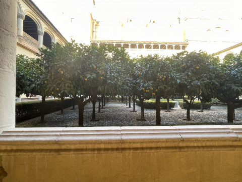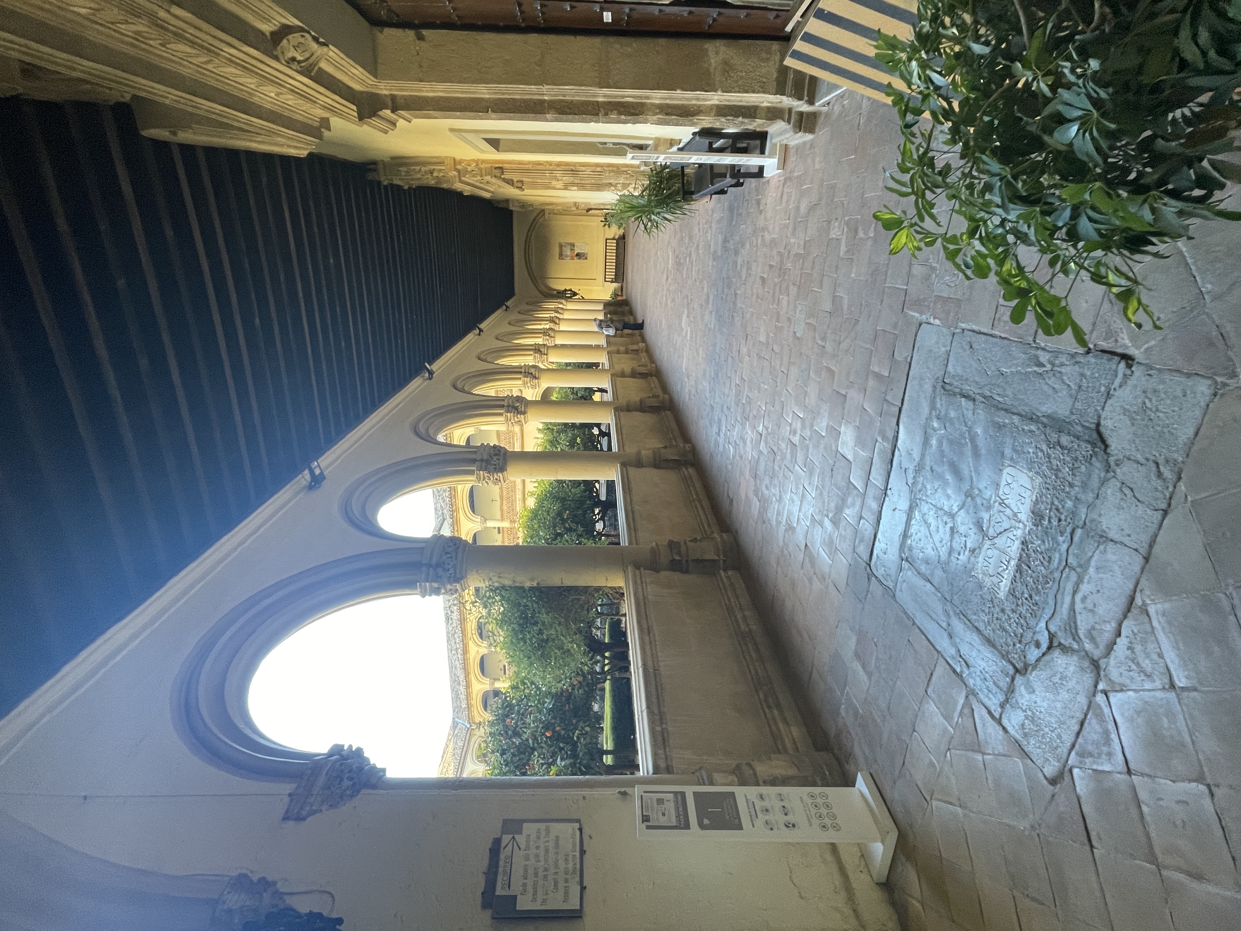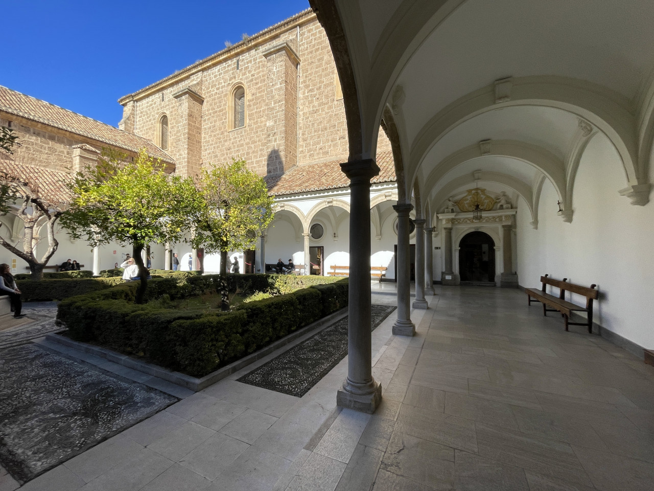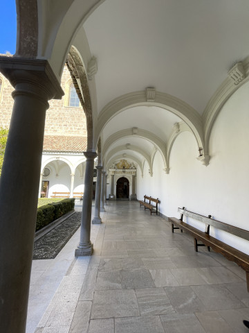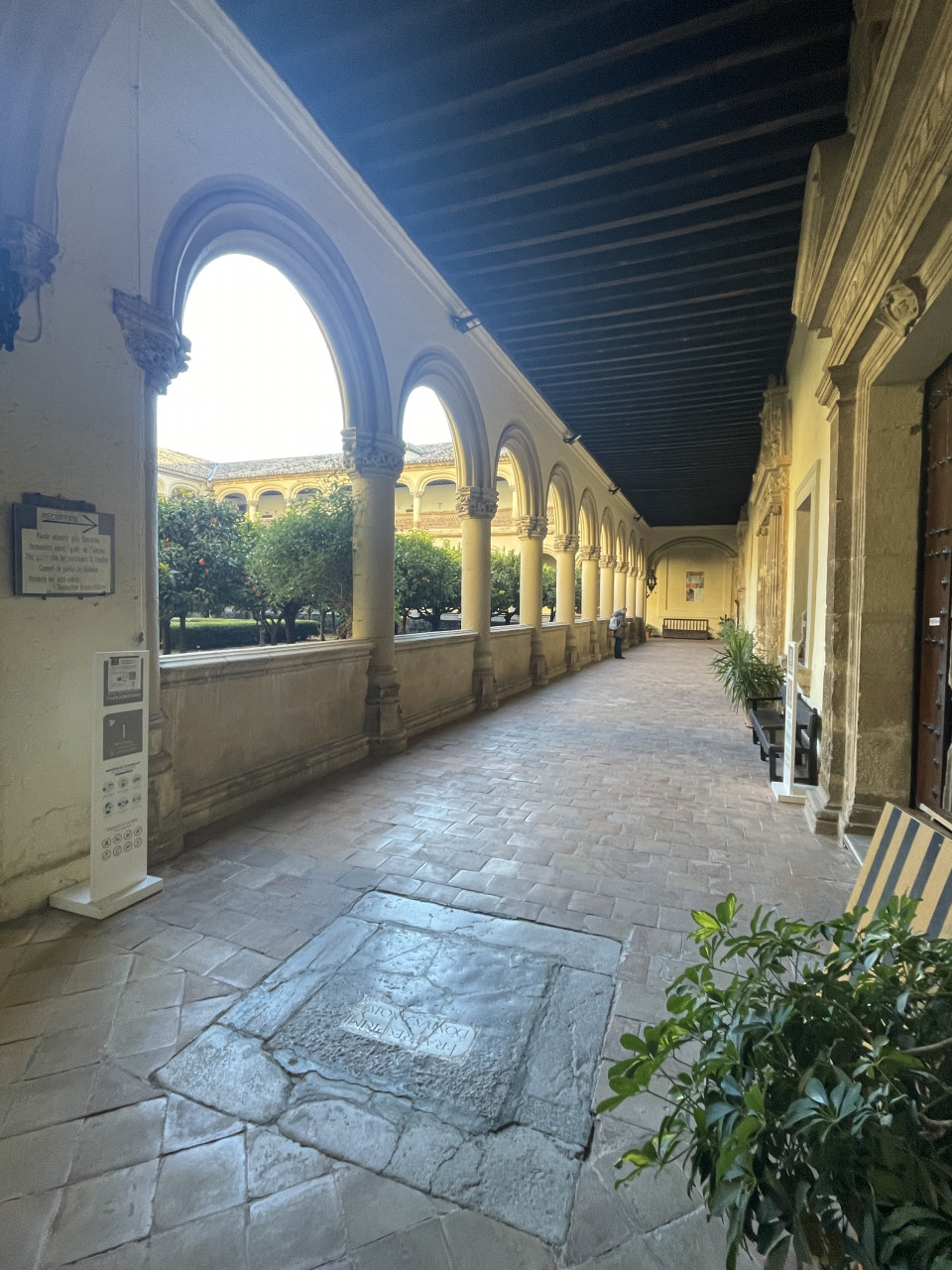 Sehr beeindruckend ist der Hauptkreuzgang mit Blick auf den Innenhof mit den Orangenbäumen und mediteranen Pflanzen. Vom Kreuzgang aus betritt man das Refekterium und neben weiteren Räumen den Kapitelsaal. Schließlich kommt man vor dem Betreten der Kirche noch zur Sakristei. Beim Betreten der Hauptkapelle fällt das große Altarbild mit lehrhaften und katechetischen Darstellungen des Lebens Jesu und seiner Mutter, der Jungfrau Maria auf. Die Seiten vermitteln eine andächtige Atmosphäre und zeigen bekannte und verehrte Heilige.